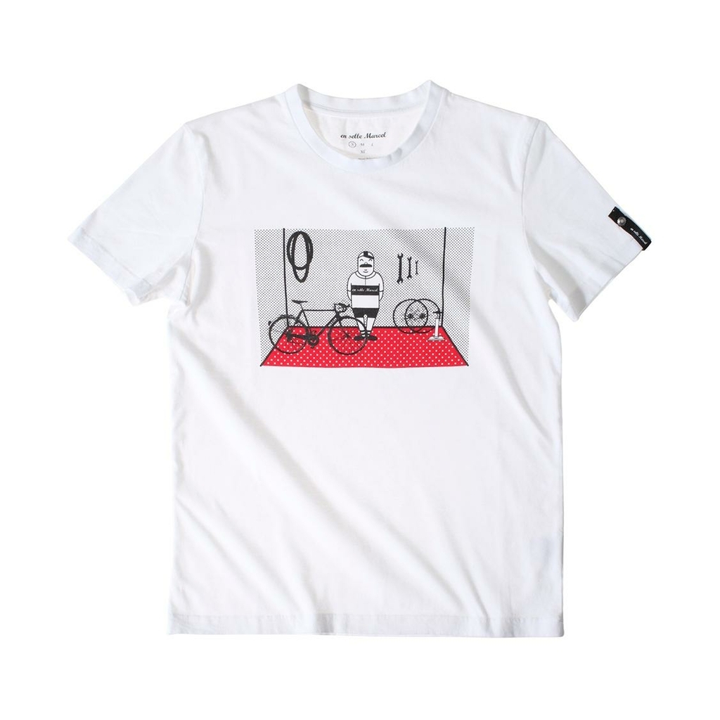 Le Tee-Shirt unisexe EN SELLE MARCEL Atelier, ici décliné en coloris blanc et rouge, est un maillot à manches courtes, conçu pour vos sorties à vélo ou simples balades.