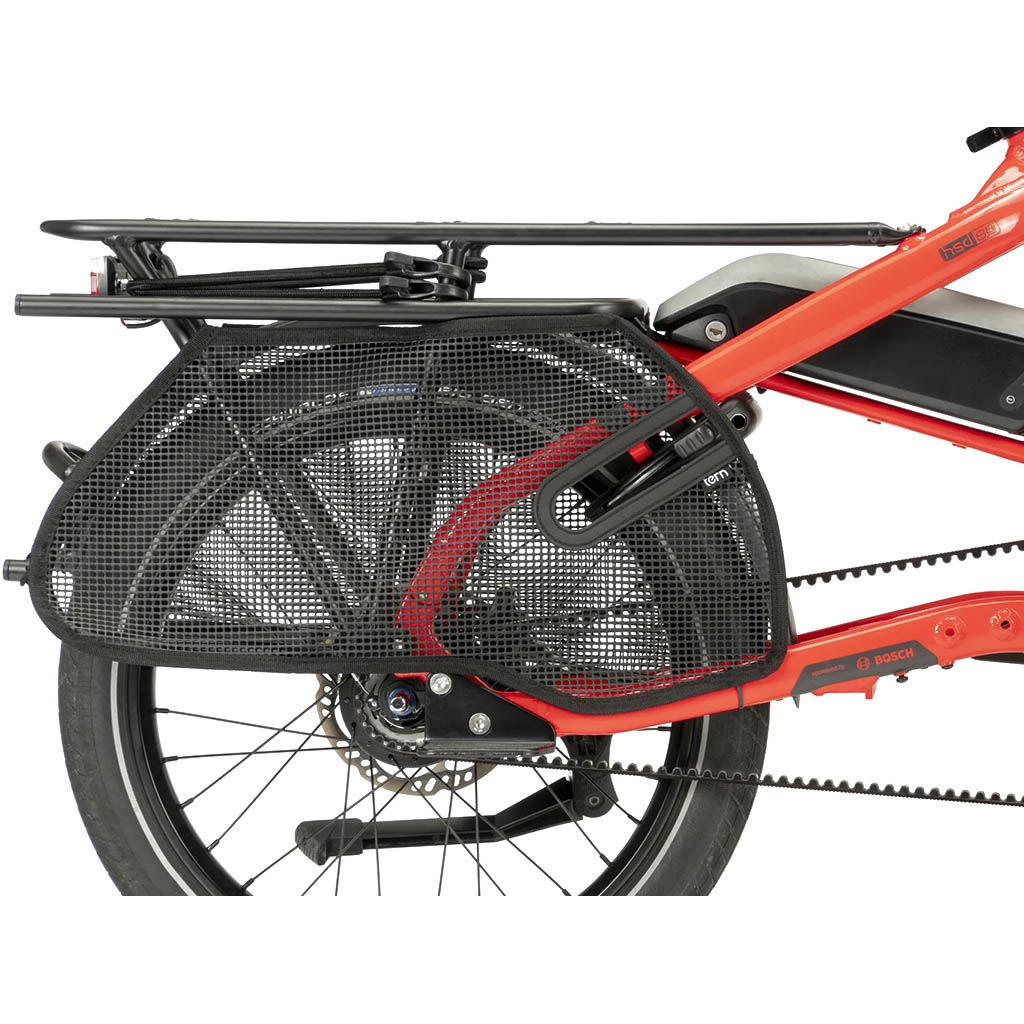 Le "Sidekick Wheel Guard M" de TERN, est une paire de mini jupes en filet qui protègent les pieds des jeunes passagers à l'arrière de votre vélo, qu'ils soient assis sur el Sidekick Seat Pad, la Captain's Chair ou sur un siège enfant sans repose-pieds avec protection pour la roue. La conception du Sidekick Wheek Guard M protège également le passager arrière en empêchant que les lacets, le manteau au la jupe puissent se coincer dans la roue arrière.